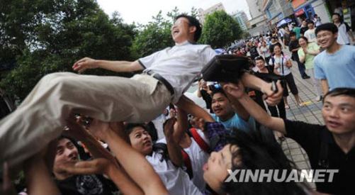 6月8日,學(xué)生們將班主任舉起歡慶,小偷(右下)趁機(jī)偷竊班主任手臂上的皮包。6月8日下午,2009年全國(guó)高考湖南考區(qū)考試結(jié)束。在長(zhǎng)沙市一中考點(diǎn)門口,由于考生家長(zhǎng)眾多,吸引了趁亂行竊的小偷。其中一群考生在將班主任高高舉起慶祝之際,一名小偷趁亂偷走了班主任的皮包。師生和記者發(fā)現(xiàn)皮包丟失后,根據(jù)記者提供的圖片尋找小偷,但小偷已逃之夭夭。新華社記者李尕?cái)z