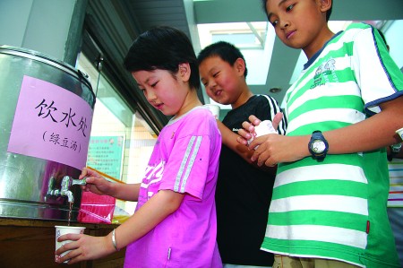 24日,槐蔭區中小學校進行了本學期的階段性測試,記者在濟南市經七路第一小學看到,學校為學生們熬好了綠豆湯,學校衛生室為每個教室準備了藿香正氣水、人丹、清涼油等防暑的藥品,保證學生安心考試。