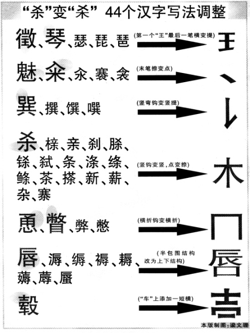 據《信息時報》報道,《通用規范漢字表》擬對44個漢字“動刀整形”,調整其寫法,記者留心發現,44個漢字中,不少字都是平時的常用字。比如:“琴”、“唇”、“親”、“雜”、“殺”等,而新規范的寫法又與原字只是個別筆劃上略有變化,整體相差不大。