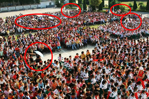 新學期開學后的一天下午,時值“秋老虎天氣”,氣溫達到三十四度,濱海縣實驗小學兩千余名小學生服裝整齊地聚集在烈日下的大操場上舉行秋學期開學典禮。次日,該縣教育網站發了題為《濱海縣實驗小學舉行2009年秋季開學典禮》的報道,隨文還配發了三幅圖片,其中有一圖片顯示,密密麻麻的學生方陣中,約有十位女教師打傘防曬。