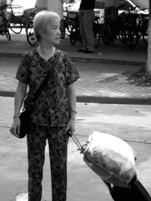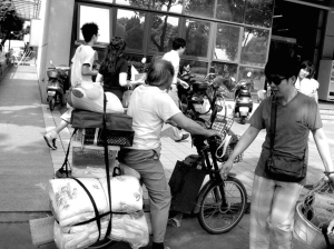 爺爺輩的送新族——一位頭發花白的老者騎著一輛電動車,車后綁滿了大大小小的包裹、箱子。一個女孩皺著眉頭對老者抱怨著什么。原來,女孩因為父母沒能陪同前來非常生氣,她向老人埋怨說,別人都有父母代辦手續,而自己必須獨自排隊繳費。老人的銀發在風中顯得零亂,額頭上滲出的汗珠在秋日的陽光里閃閃發亮。