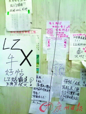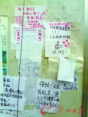 上海第二工業大學河東校區的一些學生,因不滿校園網速極慢,連上QQ都困難,紛紛在寢室門口張貼出一份份類似網上灌水的“跟帖”,集體聲討學校網絡公司(如圖)。有同學把這種頂帖的盛況拍下來放到網上,引來不少網友的關注,有網友稱平時大家在網上發牢騷,學校根本不知道,但通過這種現實跟帖的方式,學校就不得不關注。上海第二工業大學相關負責人回應稱,目前事情已經解決。