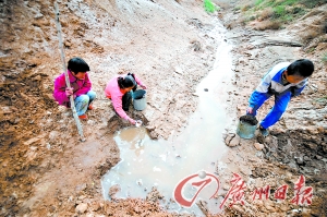 孩子們在渾濁的小溪里取水。