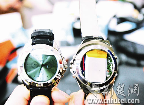 “竅門在這里!惫ど倘藛T把手表后蓋揭開,里面多了一塊微型電路板和芯片。原來,這是一套短信接收裝置,收到短信后,還可以存儲在手表中。