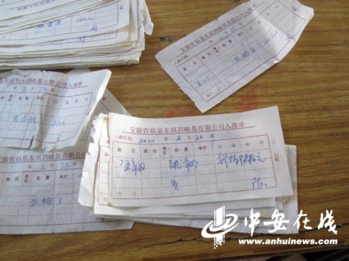 李校長還給記者出示了今年收取260元費用的收據,收據上居然印著“安徽省臨泉東風調味品有限公司入庫單”的字樣,上面寫著學生的姓名、班級和所交的260元費用,每一張右下角都是用相同筆跡簽了一個“周”字,據李校長介紹簽“周”字的人是陳子玉的兒媳婦,她負責來學校收錢。