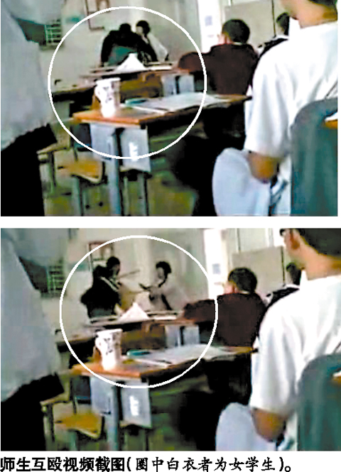 然而,該女生毫不示弱,拿起凳子扔向老師。打斗場面并未結束,老師再從一邊撿起該女生砸來的板凳回敬了該女生,兩人一直廝打到教室門口處,直到一教師模樣的人從門外沖進教室,雙方才結束“戰斗”。
