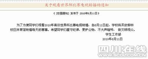 西財在校學生小徐在本報大成網新聞報料臺轉發了這則通知:“2010年南非世界杯開幕在即,世界杯比賽期間正值國家英語四六級考試和期末復習考試階段,為了維護學校的正常教學和生活秩序,確保同學們能夠正常的休息,以良好的狀態溫課迎考,應廣大同學和學生家長的要求,學校決定自6月11日起至賽事結束,學生公寓熄燈以后校園網絡也將暫停使用!