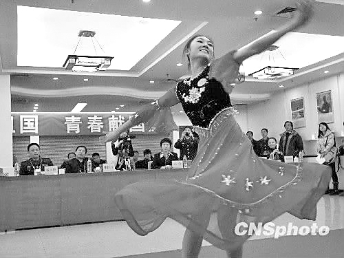 8時(shí)10分,面試開(kāi)始,第一個(gè)上場(chǎng)的陳曉琴做了簡(jiǎn)單的自我介紹,大屏幕顯示她抽中的問(wèn)題是:如何能做一個(gè)合格的軍人。陳曉琴說(shuō),要做一名合格的軍人不但要嚴(yán)明紀(jì)律、聽(tīng)從指揮,還要團(tuán)結(jié)同志。接著她表演了跆拳道,并拿下了北京市女兵面試的第一個(gè)分?jǐn)?shù)——26分,全部考試,陳曉琴用了8分鐘。 8時(shí)50分,來(lái)自民族大學(xué)舞蹈學(xué)院的5號(hào)應(yīng)試者朱瑜上場(chǎng)了。回答了相關(guān)的問(wèn)題后,她拿出了一把藍(lán)色的綢扇,跳起了一套她自編的舞蹈,婀娜的舞姿征服了全場(chǎng)的觀眾,也征服了9位評(píng)委,她得了28.57的高分,這個(gè)分?jǐn)?shù)也是海淀考區(qū)全天考試的最高分。與她同樣得了最高分的還有清華大學(xué)的王曉麗。