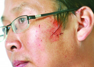 昨天,記者在新集中學見到陳宏濤,他的左耳上部腫得老高,顴骨處有一道約兩寸長的傷口,鼻梁處也有幾道血口子。