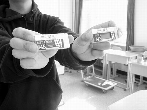 11日上午第一科進行的是基礎知識考試,試題均為客觀選擇題。10點,到了規定的開考一小時后可以離場時間,陸續有考生走出考場,但仍有不少考生仍在埋頭認真答卷。但一名女考生卻引起監考人員注意。她不看試卷,卻不時擺弄手中的橡皮。橡皮有什么好玩的?監考人員走上前去,拿起橡皮端詳。這塊標有“晨光”牌的橡皮十分常見,外觀上看沒什么特別,但其外包裝紙卻有被揭開的痕跡。監考人員揭開包裝紙,竟然發現這是一個類似微型BP機的接收設備,上面正顯示出各試題的答案。