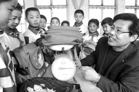 圖為山東省博興縣博昌街道辦事處伏田小學校長王學農抽查學生書包的重量。該校規定每天放學學生帶回家的課本重量不得超過1.5公斤。王蕾 孫國棟 攝