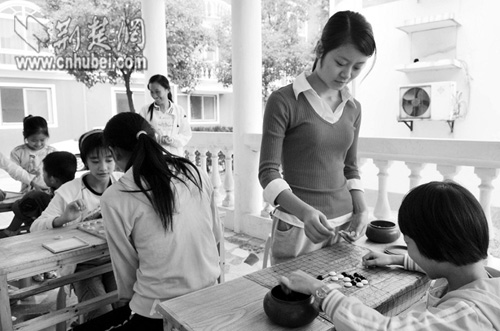 圖為:課間,劉文靜和孩子們切磋棋藝(右二) 記者劉蔚丹攝