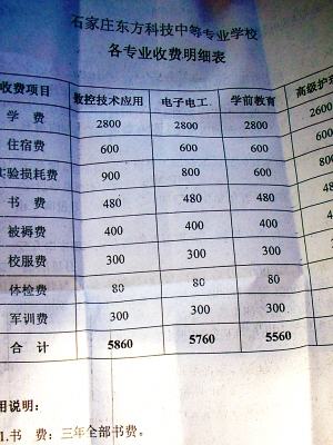 如果學生想自己找實習單位,就要交3000元錢。其中1000元是注冊費,2000元是伙食費!拔覀兪桥c石家莊協和醫學院聯合辦學的,發的是那所學校的畢業證,注冊什么的都需要錢,這個錢就得學生來出!边@位老師說,從去年5月份開始,學校的食堂就對學生和教職工免費開放了。小張去年7月從廣東打工回來,暑假后來上學,從9月到現在,在學校免費吃了7個月的飯,按每月300元算,是2100元,學校收2000元是合適的。