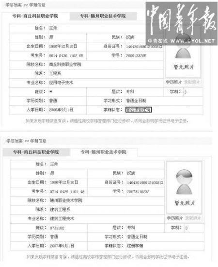 從學籍科老師處知道自己的身份可能被盜用的消息后,王帥登錄中國高等教育學生信息網查詢。他發現自己的身份下有兩個學籍信息,一個是自己2007年入學的隨州職業技術學院,另一個則顯示為:2006年9月1日入學商丘科技職業學院工程系應用電子技術專業,學制三年專科,學籍狀態為已畢業。后者的姓名、出生日期、身份證等信息均與自己相同,考生號則為自己第一年參加高考的準考證號。兩個學籍信息均沒有照片。