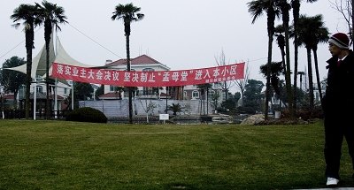 昨日,“孟母堂”和錦軒新墅小區(qū)的大門都已恢復(fù)平靜,小區(qū)大門處懸掛著一條紅色橫幅,上面寫著“堅決制止‘孟母堂’進(jìn)入本小區(qū)”,落款為“錦軒新墅業(yè)委會”。