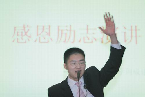 昨日下午4點,記者在重慶八中禮堂見到了正在做勵志演講的西政經貿法學大四學生周成建。演講臺上,周把自己的人生經歷、奮斗經歷編織成故事講給中學生聽。