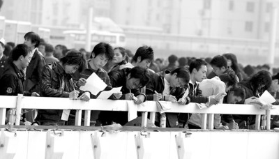 圖片說明:在上海體育館舉行的“春季綜合人才招聘會”上,求職者在填寫求職信息登記表