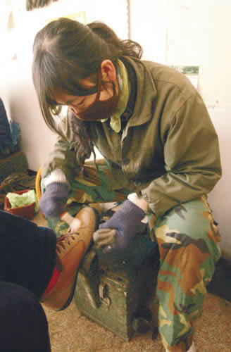 放假在家的她,白天呆在臺安縣新華書店一樓的過道里擦皮鞋,見有顧客來,她馬上拿起鞋刷,熟練地打油上色,掙2元擦鞋費。