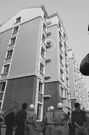 記者看到,在7層高的樓房的5樓外墻的空調座板上,坐著一位身穿休閑服的男孩,其身靠著一口醬缸,雙腳耷拉在水泥板邊緣,向樓下大聲喊著“別鋪氣墊,跳啦!跳啦!”嚇得眾人急忙撤去氣墊。樓下的人們幾乎無人做聲,生怕男孩真的跳下來,因為他已經從7樓下到了5樓。