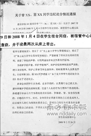 1月4日,廣州大學城某工業大學一女生留男生在宿舍過夜被學校抓獲,兩人近日被學校記過處分。這是該校在大學城校區首次對男女同宿現象公開處罰。該校宿管中心主任表示,在接下來的時間,學校還將陸續公布10多個涉及“男女同宿”的學生處罰名單。