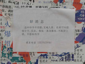 在東北師范大學就讀的郭同學告訴記者,前不久她在宿舍樓下的留言板上也發(fā)現(xiàn)了一張類似內(nèi)容的廣告單,上面印有“意外懷孕不用愁,XX醫(yī)院來解憂,采用超導可視無痛人流,不損傷正常組織……”郭同學說:“很多女同學看到這樣的廣告都臉紅了,即便現(xiàn)在社會比以前開放了,但這種廣告也不該出現(xiàn)在校園里吧。”