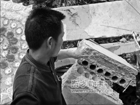 熊永豪認(rèn)為,除了設(shè)計(jì)上的先天不足,教學(xué)樓在后期施工中,也存在不少隱患。站在廢墟上,他隨手撿起一塊磚頭,上面光滑平整,幾乎沒(méi)有粘著水泥。“這表明兩個(gè)問(wèn)題,可能是水泥的標(biāo)號(hào)不夠,或者是涂在磚上沙灰飽和度不夠。”熊永豪說(shuō)。