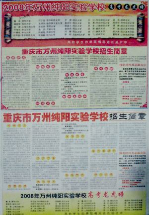 昨日,萬州多所學(xué)校老師向本報(bào)投訴稱,該區(qū)純陽實(shí)驗(yàn)學(xué)校造假,編了一個(gè)叫魏來的考生,在報(bào)紙上打廣告說他考上了清華大學(xué)。記者注意到該招生廣告分兩部分,上面是“2008年純陽學(xué)校高考龍虎榜”,下面是招生簡章的具體情況。龍虎榜上是該校今年高考錄取動(dòng)態(tài),包括學(xué)生姓名和錄取院校。其中排在榜首的叫“魏來”,錄取院校是清華大學(xué)。廣告在本月14日和16日兩天刊登,一時(shí)間純陽實(shí)驗(yàn)學(xué)校今年有學(xué)生考上清華大學(xué)的消息,成為當(dāng)?shù)睾芏嗉议L和市民的談資。萬州某中學(xué)一位不愿透露姓名的中干說,一些家長就此拿著報(bào)紙罵他們,有那么多好的生源卻教不出“北大”、“清華”來,他們感到很是委屈。