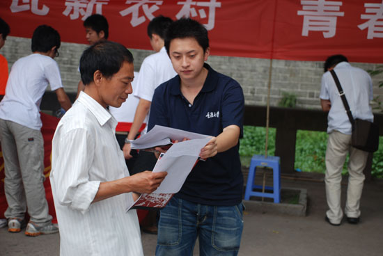 7月14日上午,適逢長沙鎮趕集,開縣團縣委聯合重慶工程職業技術學院大學生暑期三下鄉社會實踐團在長沙鎮開展改革開放三十年成就宣講服務活動。當日上午,三十名宣講成員冒著酷暑向過往群眾宣講,宣講活動按思想建設、國防科技、百年奧運、民主法制、社會民生等10個部分圖文資料生動地展現了祖國改革開放三十年取得的巨大成就。駐足觀看的群眾絡繹不絕,在展覽前打起了傭堂,他們有的深情凝望圖片資料,有的和大學生攀談改革開放三十年來自己生活的變遷。