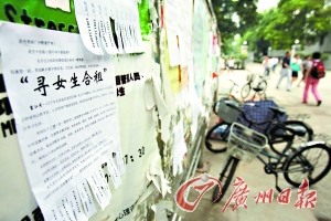 記者在中大校園內(nèi)學(xué)五飯?zhí)玫墓鏅谏,貼滿各種各樣的“求租”、“出租”廣告,在該學(xué)校附近城中村和小區(qū)街道的墻上則也隨處可見(jiàn)“臨時(shí)房屋出租”的廣告,沿主要街道兩側(cè),幾乎每個(gè)店鋪門(mén)前都立有醒目的臨時(shí)房屋出租廣告牌。