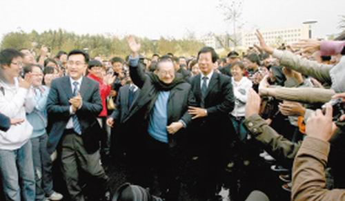 金庸在校園里向學生揮手致意 記者 李洪亮 攝