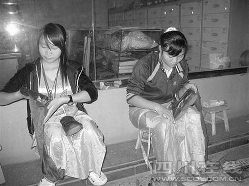 在一家火鍋店,電子專業高二學生邱飛詢問一位顧客是否需要擦鞋——行話叫做“聯系貨物”。和一般的擦鞋人一人擦一雙不一樣,學生們的擦鞋是流水作業:第一人先用清水勾縫、第二人上油、第三人用刷子拋光、第四人用抹布拋光……一雙皮鞋經數人之手后,換得1元酬勞。