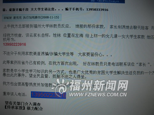 吳同學將情況反映給師大傳承家教中心。15日傍晚,在福州便民論壇,一則標題加亮的帖子《最新詐騙手段,女大學生請注意,騙子手機號……》發布。帖子寫著:“上午我方接到福州大學教員反映,她接的家教,家長利誘她去聊天陪客,月薪上千。經核查,該家長自稱姓林,家住左海附近,給上初一的女兒請一名女大學生當家教。他還特意強調要家庭貧困的女大學生,該家長手機號為139xxxxxxx6”。該帖子也寫明了他們之所以曝光該家長手機號碼的原因:“我們不想讓女生被不法之徒玷污。”