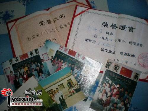 代課教師郭海菊生前獲得的榮譽證書和她與學生們的留影