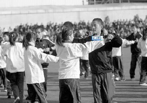 西安一中學,跳廣播體操的學生,男生大多短發,女生大多梳著辮子。