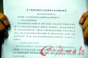 記者從該學校學生會2008年12月15日下發(fā)的一份蓋有公章的《關于收取2008~2009學年學生會會費的通知》上看到,收取會費的根據是佛山職業(yè)技術學院第三次學生代表大會通過的《佛山職業(yè)技術學院學生會章程》(修改)中的有關內容,“凡取得佛山職業(yè)技術學院學籍的在校學生,均為本會會員”、“學生會經費來源,會員在校期間交納學生會會費(每人每年20 元),由系學生會收繳,留用70%,上繳學院學生會30%。”
