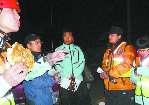 昨天晚上,當記者來到北京市植物園西門的時候,門旁邊的花池子邊上,放著救援隊員帶來的烙餅、鴨脖子、雞腿,還有成箱的礦泉水,下午4時出發前兩組隊員剛剛返回,很多人因為上山前未吃飯都開始“狼吞虎咽”。