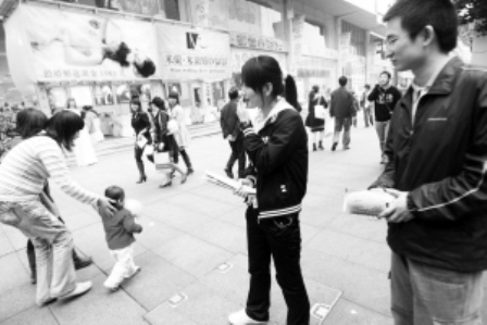 40分鐘后,9名學生來到觀音橋。10時許,張玉琴鼓足勇氣走向一家婚紗店,老板給了她一疊宣傳冊,“不管用何種方法,只要是能找夠15名顧客來店咨詢,就可得到30元錢!边@是這個團隊第一個找到“工作”的人。