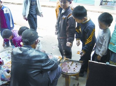 昨日12時(shí)20分,正是學(xué)校放學(xué)的時(shí)候,記者現(xiàn)場(chǎng)看到,門口一家文具店里赫然擺著抽獎(jiǎng)機(jī)。許多孩子圍在一起,他們買來(lái)卡片按卡面印刷的獎(jiǎng)品現(xiàn)開(kāi)現(xiàn)兌。校門口左邊,還有一個(gè)老人擺著彈珠子的小賭博機(jī);右邊,一個(gè)婦女?dāng)[抽獎(jiǎng)攤,同樣吸引了不少學(xué)生(見(jiàn)圖)。