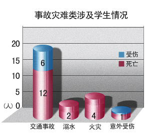交通事故 2008年發生的10起交通事故中,5起發生在外地,分別系學生自行外出旅游、寒暑假返鄉等途中遭遇車禍,共造成7人死亡;另有5起為學生在本市校外社會道路上遭遇車禍,造成5人死亡。
