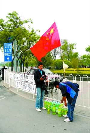 昨日下午,九棵樹地鐵站口北側的十字路口,陳進和同伴俞洪帶著他們的可樂飲料,在人行道柵欄上又掛起他們的橫幅標語,這次,他們插上了一面鮮紅的國旗,在風中招展。