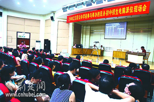 輕點鼠標,投影屏幕上一道綠色的橫線不停地跳動,一個個學生名單隨之產(chǎn)生……昨日上午,武漢市15所改制初中轉(zhuǎn)為民辦學校后,首次舉行“小升初”擇校生電腦派位。