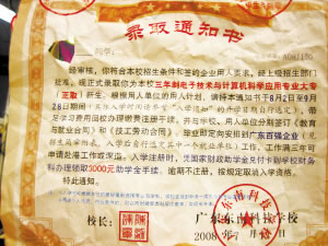 該工作人員告訴記者,廣東東南科技學校的生源來自全國各地,主要由當地的教育局推薦,都是免試入學,不看學生的高考成績,只要有高中畢業證就行。另外學校也有部分中職學位,專門給剛剛畢業的初中生提供!澳壳皩W校還有部分學位,如果沒有收到錄取通知書,可以留下姓名和地址,學校隨后就寄出通知書!痹摴ぷ魅藛T表示,三年制電子技術與計算機科學應用專業是該校歷年來最熱門的專業,學費為每年9980元。