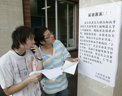 圖片說(shuō)明:師大錄取通知書發(fā)現(xiàn)造假,兩名學(xué)生正在了解告示相關(guān)內(nèi)容。
