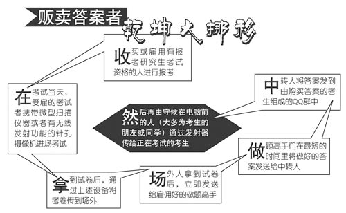 首先,雇用有報考研究生考試資格的人進行報考,在考試當天,受雇者攜帶微型掃描儀器或有無線發射功能的針孔攝像機進入考場考試,拿到試卷后,通過上述設備將考卷傳到場外,場外人拿到試卷后,立即發送給雇用好的做題高手,做題高手在最短的時間里將做好的答案發送給中轉人,中轉人再將答案發到由購買答案的考生組成的QQ群中,然后再由守候在電腦前的人(大多為考生的朋友或同學)通過發射器傳給正在考試的考生。