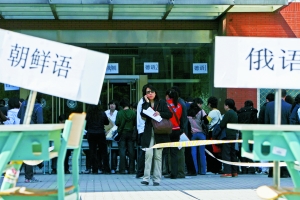 二外今年8個小語種專業計劃招收102人,昨日報名現場吸引來2300余名家長和學生。現場,一位家長拿著計算器核算一番后,決定替孩子報考朝鮮語,“這個專業報考的人少,分數自然不會太高。”