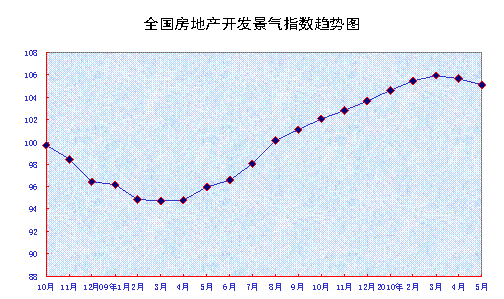 中新網6月10日電 據國家統計局網站消息,5月份,全國房地產開發景氣指數(簡稱“國房景氣指數”)為105.07,比4月份回落0.59點,比去年同期提高9.13點。