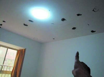 12月7日中午,在物業公司服務的王小姐走進租住的岳麓區西岸潤澤府小區6棟307房,立即發出一聲尖叫,她發現自己本來干凈整潔的床鋪上散落著大大小小的水泥塊,而本來光潔白亮的天花板出現了幾十個洞。“當時第一感覺以為是發生了地震。細數發現,竟有29個洞。”合租的一男孩子告訴記者。后來大家明白了,這是樓上裝修引起的問題。