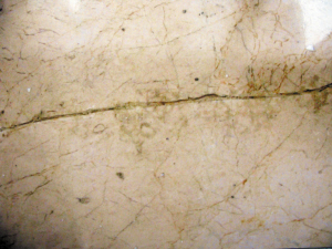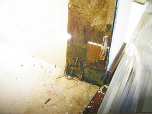 近日,記者來到羅湖寶安南路幸福里樓盤,并隨當事人李小姐前往她在小區3棟某戶的公寓。剛出電梯,一大堆裝修材料便映入眼簾,而房內也是一片狼藉一片。在公寓內部,堆放著一些拆卸下來的裝修材料及部件,客廳屋頂轉角處依稀有滲水的痕跡,衛生間及廚房部分的門框都被拆掉。除此之外,當事人還向記者指點了多處大理石的裂紋。