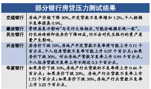 記者從多家銀行風控部門了解到,在輕度和中度的測試環境下,房價和利率的變動對銀行房地產貸款的質量影響不大,而如果房價跌幅達到三成,同時利率上升108個基點,“這將為銀行的資產質量帶來一定的麻煩”。