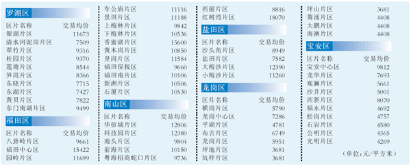記者看到,紅樹灣片區、香蜜湖片區、福田中心區位列全市普通商品房房價前三甲。均價依次為18070元/平方米、15600元/平方米和15422元/平方米。而龍崗的坪地片區、坑梓片區和坪山片區,則是此榜中均價最低的片區,均價都是3681元/平方米。(記者歐東勇)